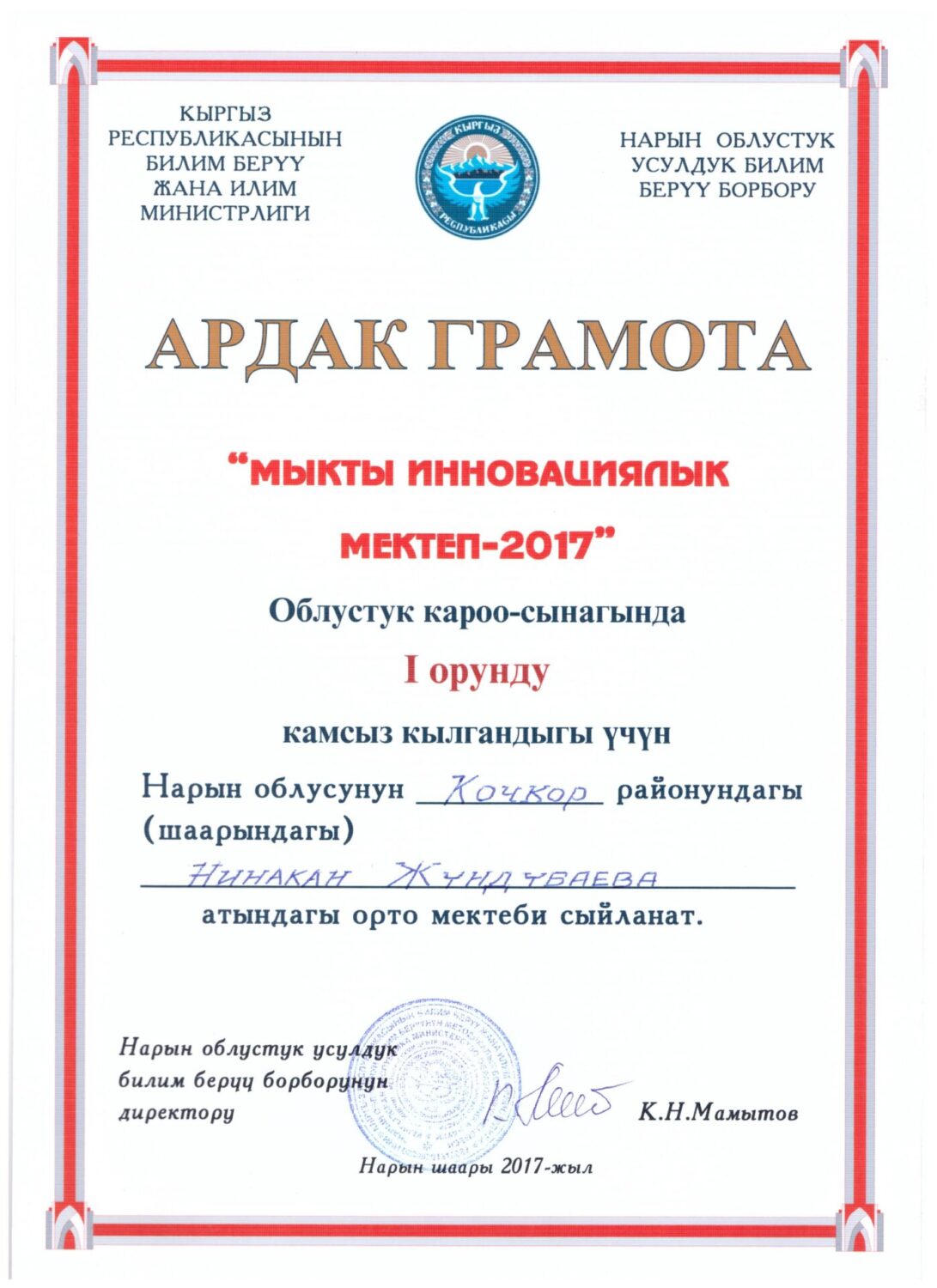 - «Мыкты инновациялык мектеп» грамота 2017 — жыл