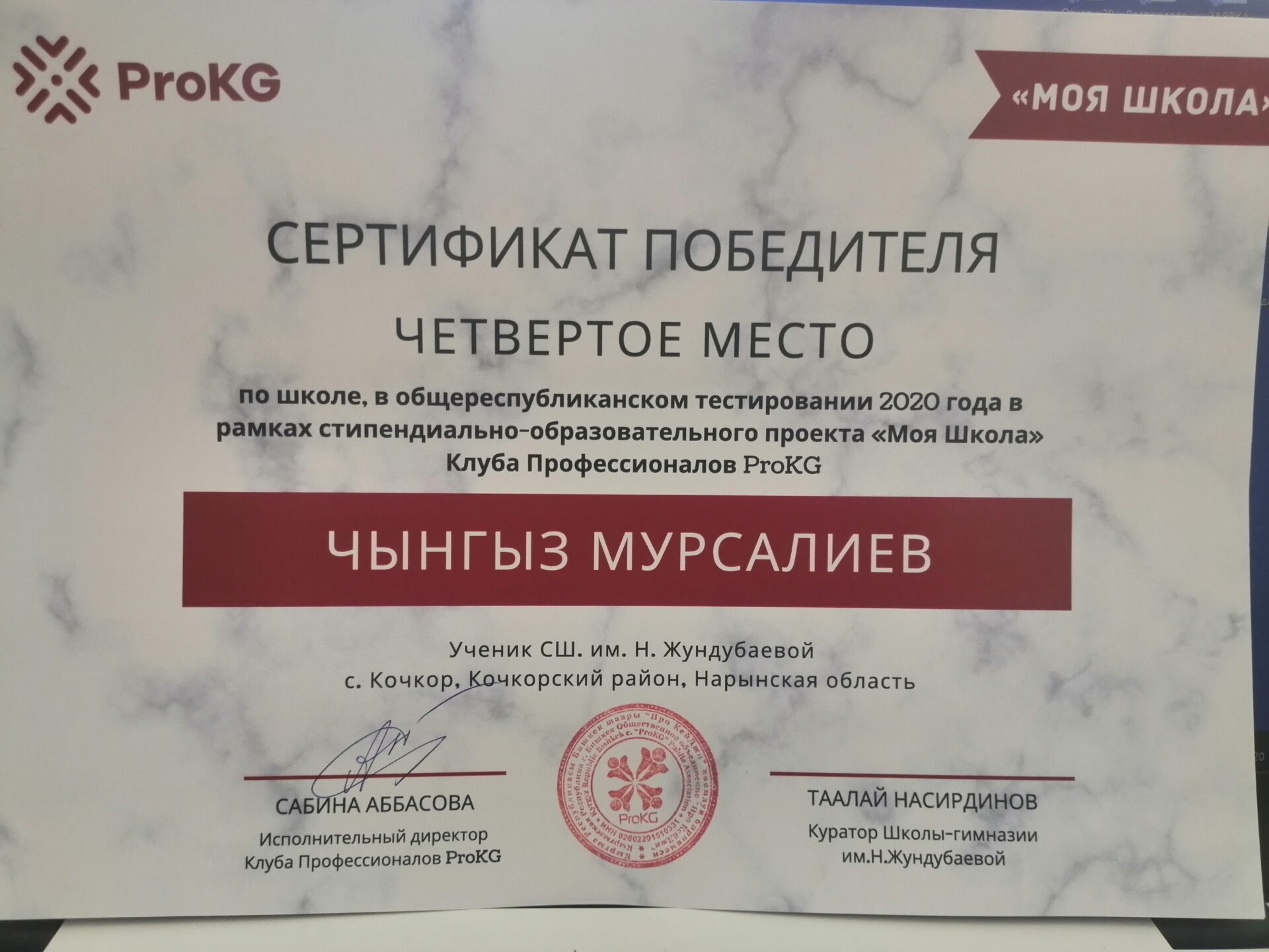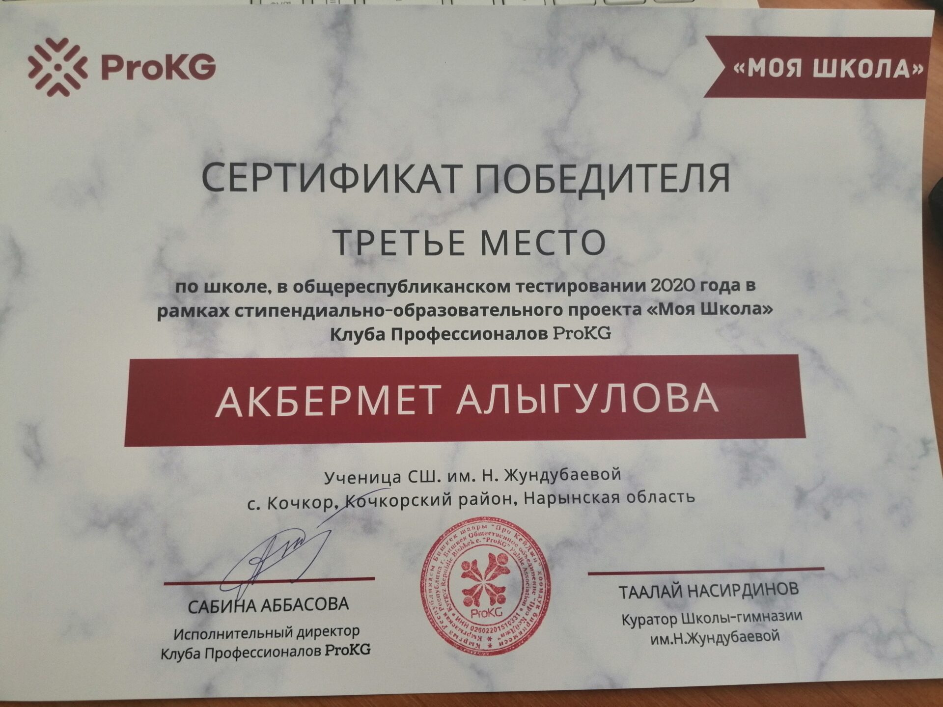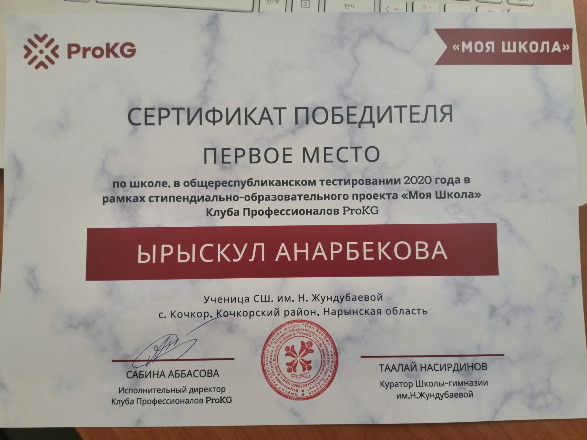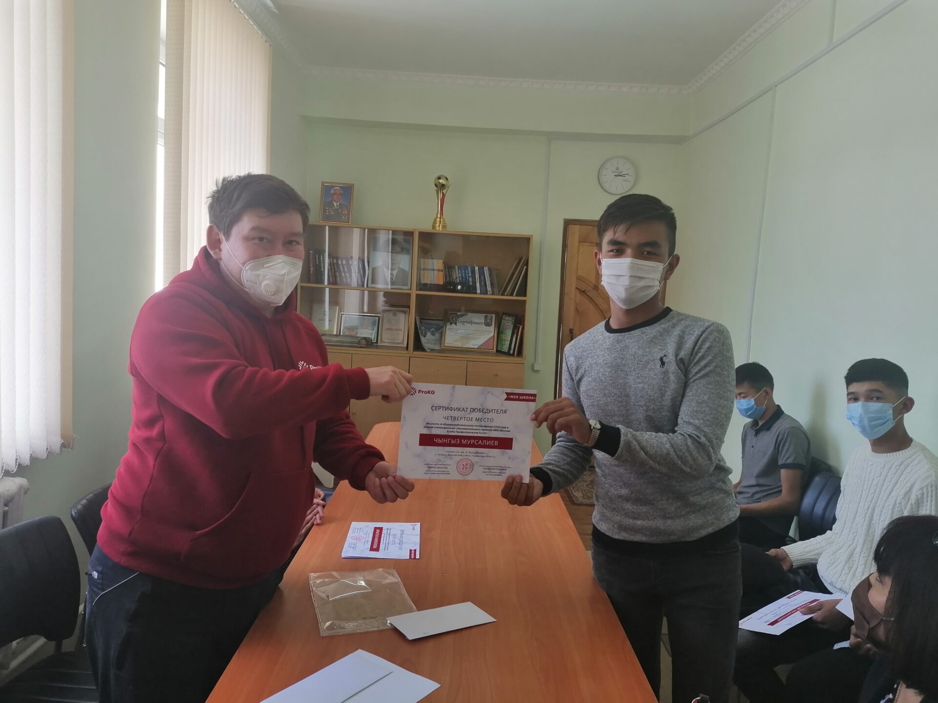 8-август «Менин мектебим» долбоорунун алкагында ProKG клубунун мүчөсү, биздин мектептин бүтүрүүчүсү Насирдинов Таалай ЖРТ алдыңкы балл алган окуучуларга сертификаттарды жана ошондой эле стипендияларды тапшырып кетти. Эскерте кетсек бул долбоорду ProKg клубу жалпы республикалык тестирлөөдөн жогорку балл алган окуучуларга 10 жылдан бери стипендия берип келет.