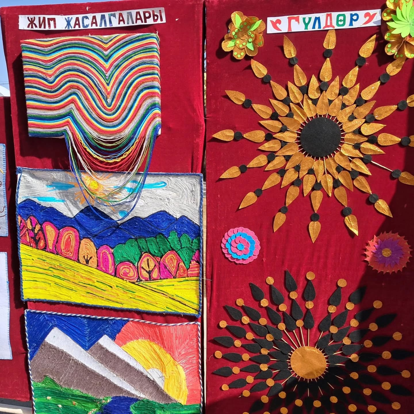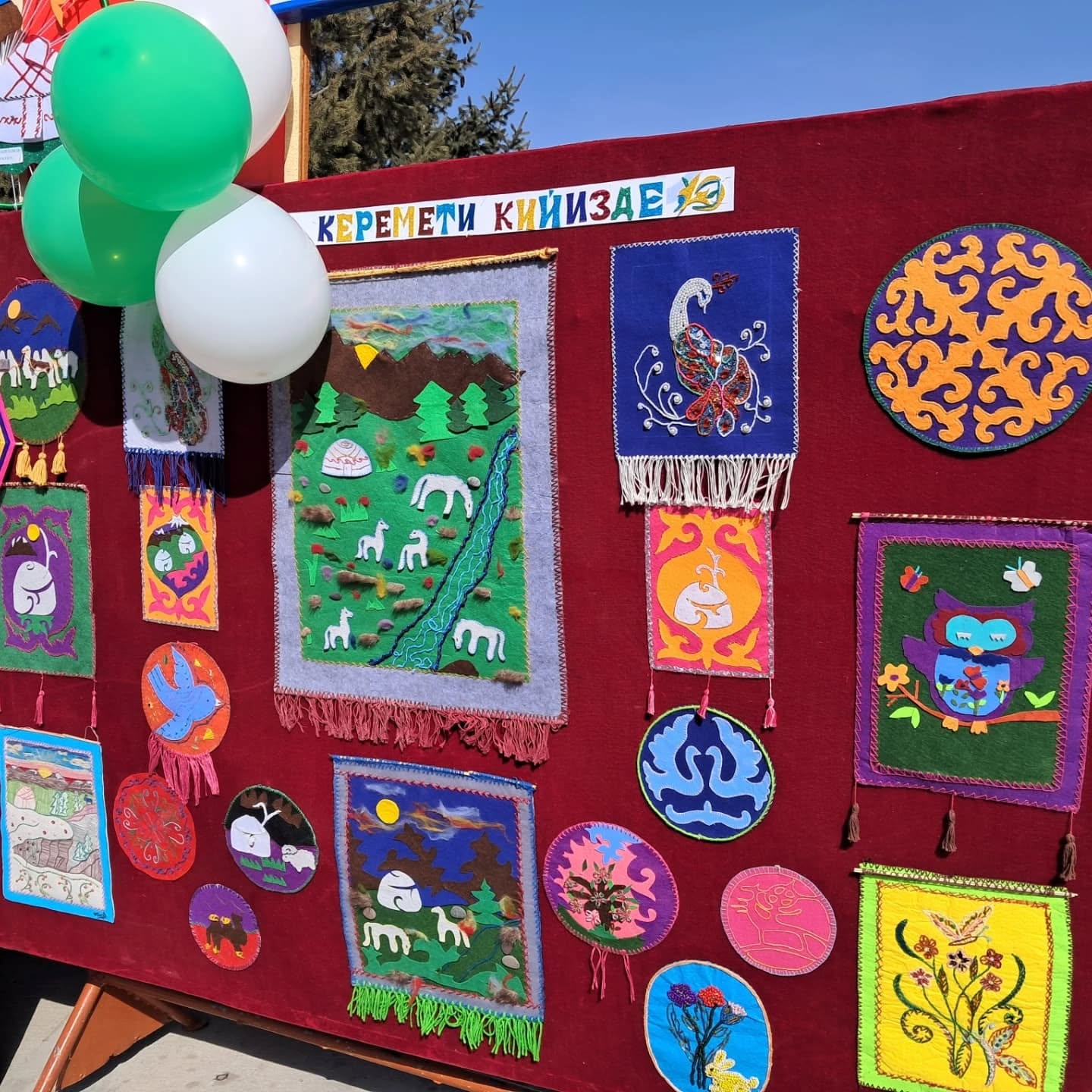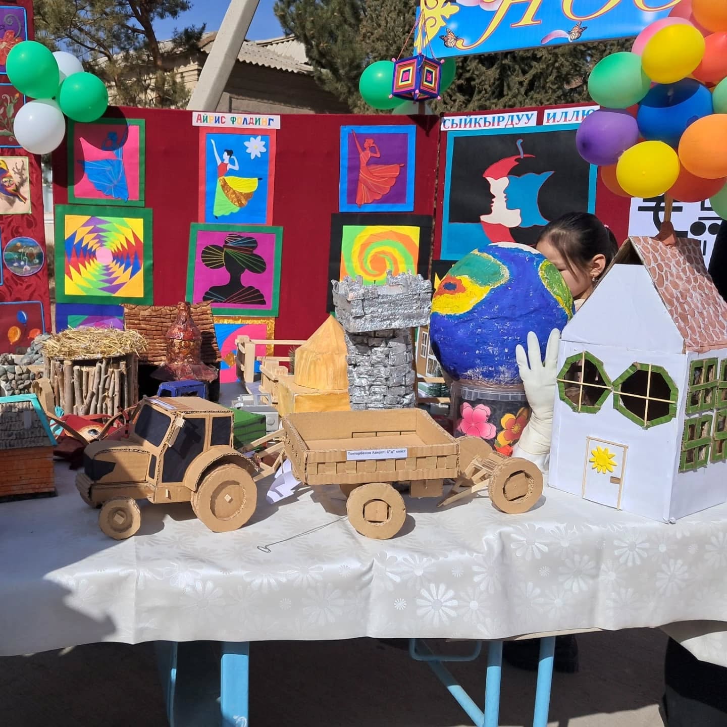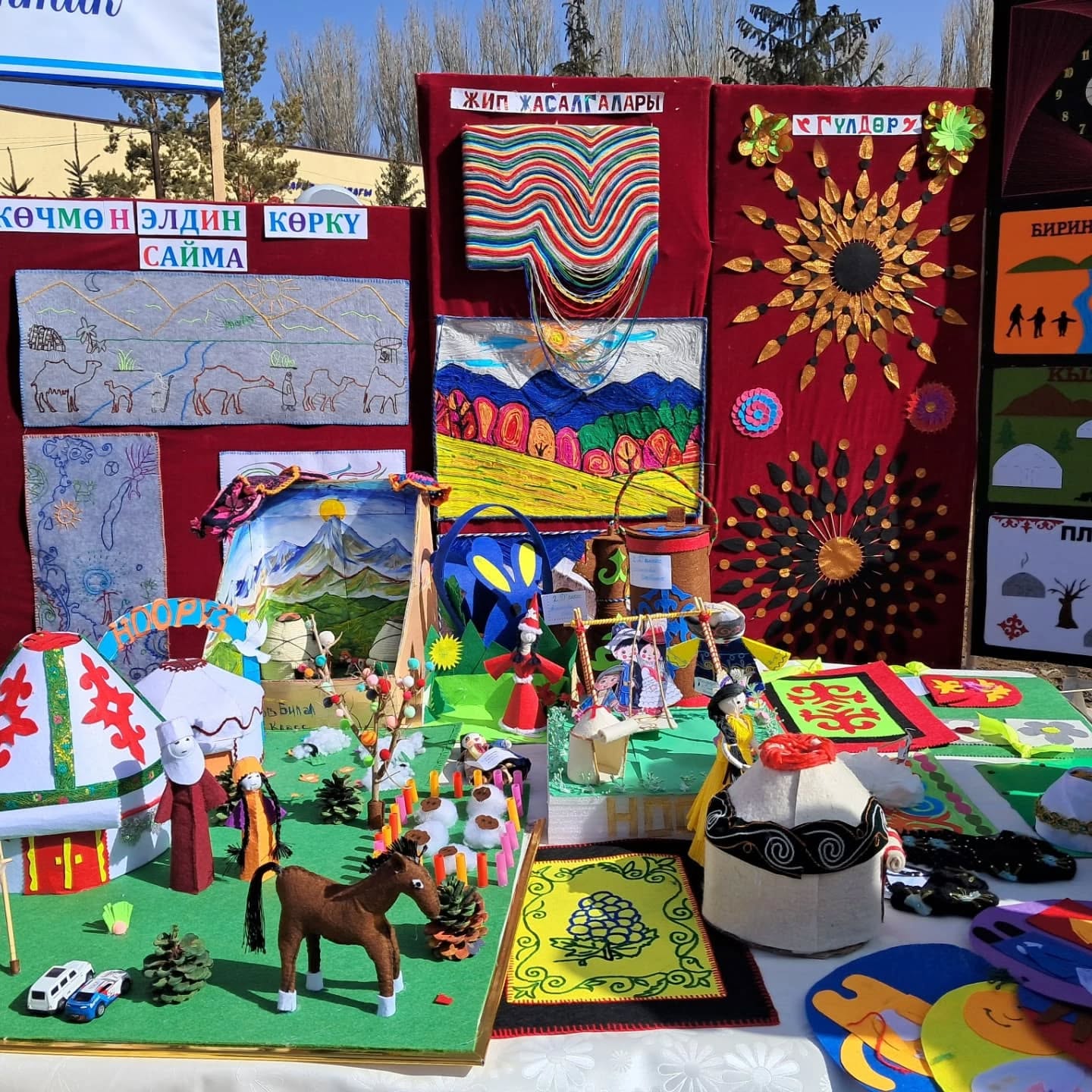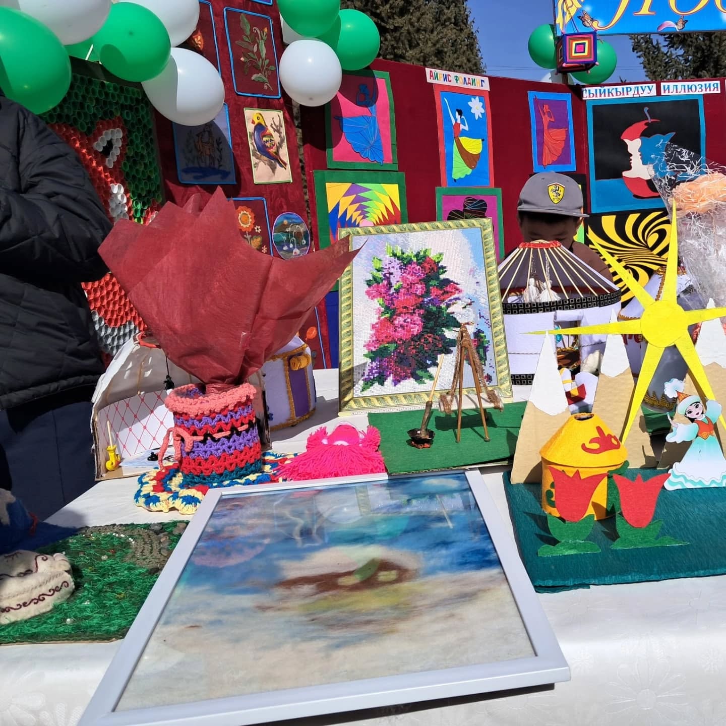 Биздин мектептин окуучуларынын, мугалимдеринин колдорунан жаралган жасалгалар да көргөзмөгө коюлду.