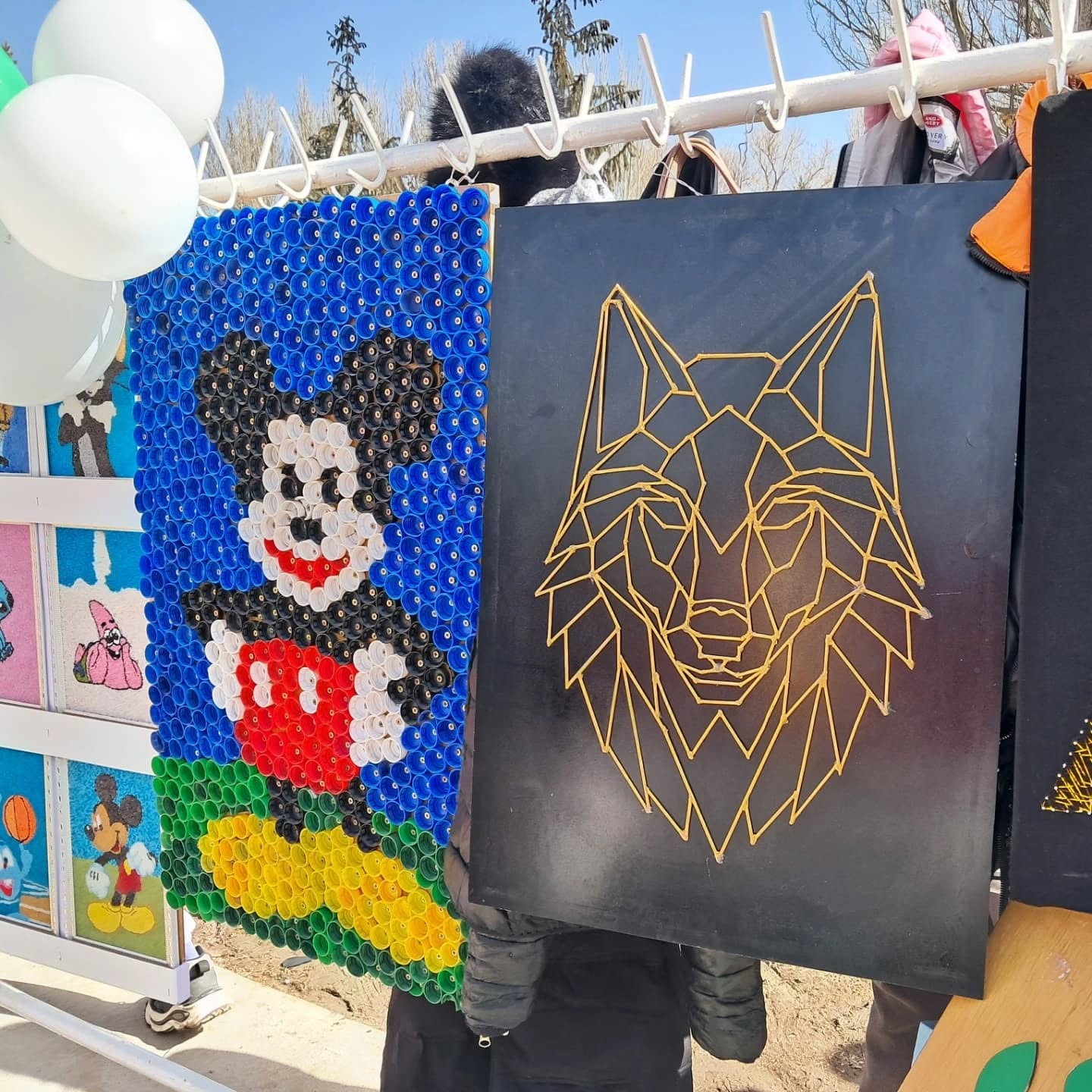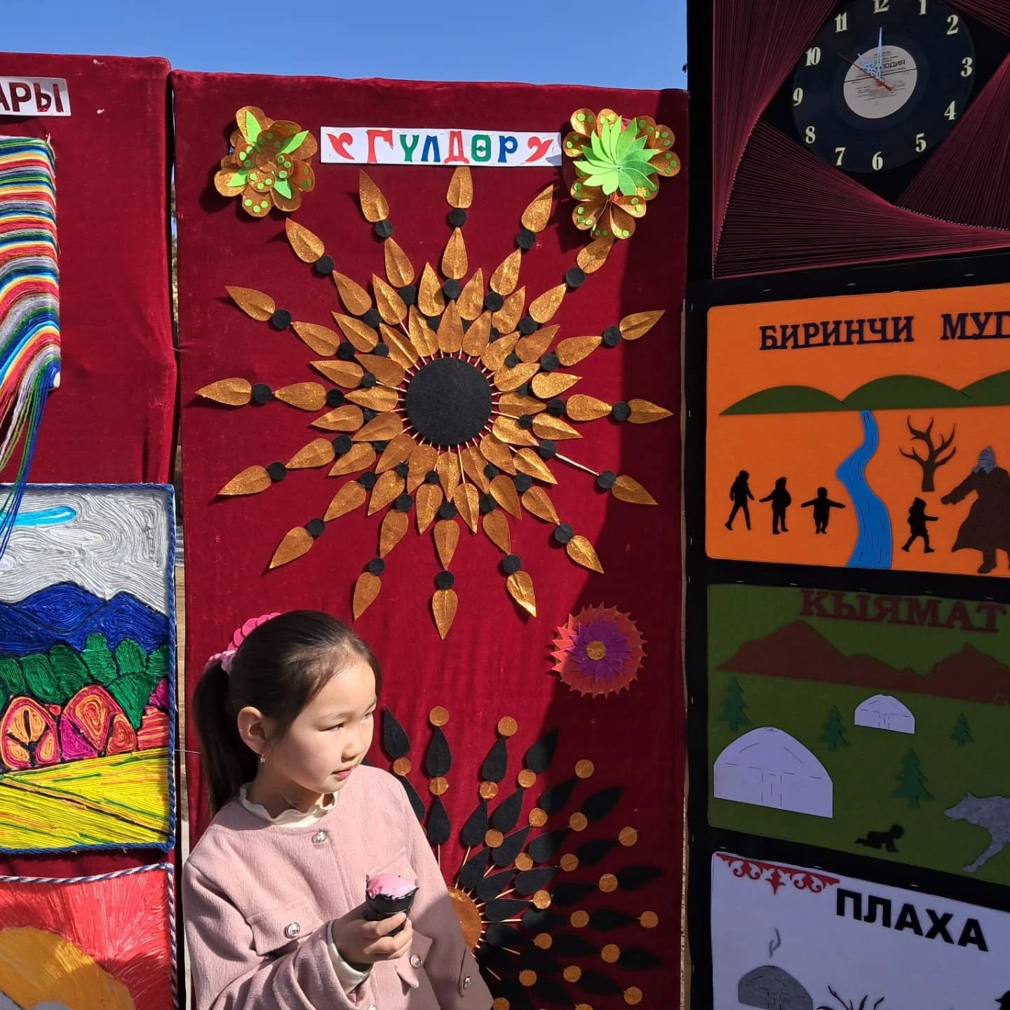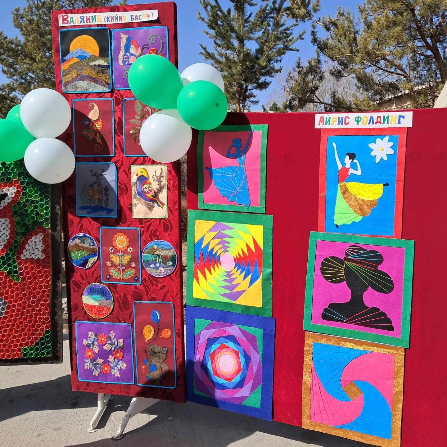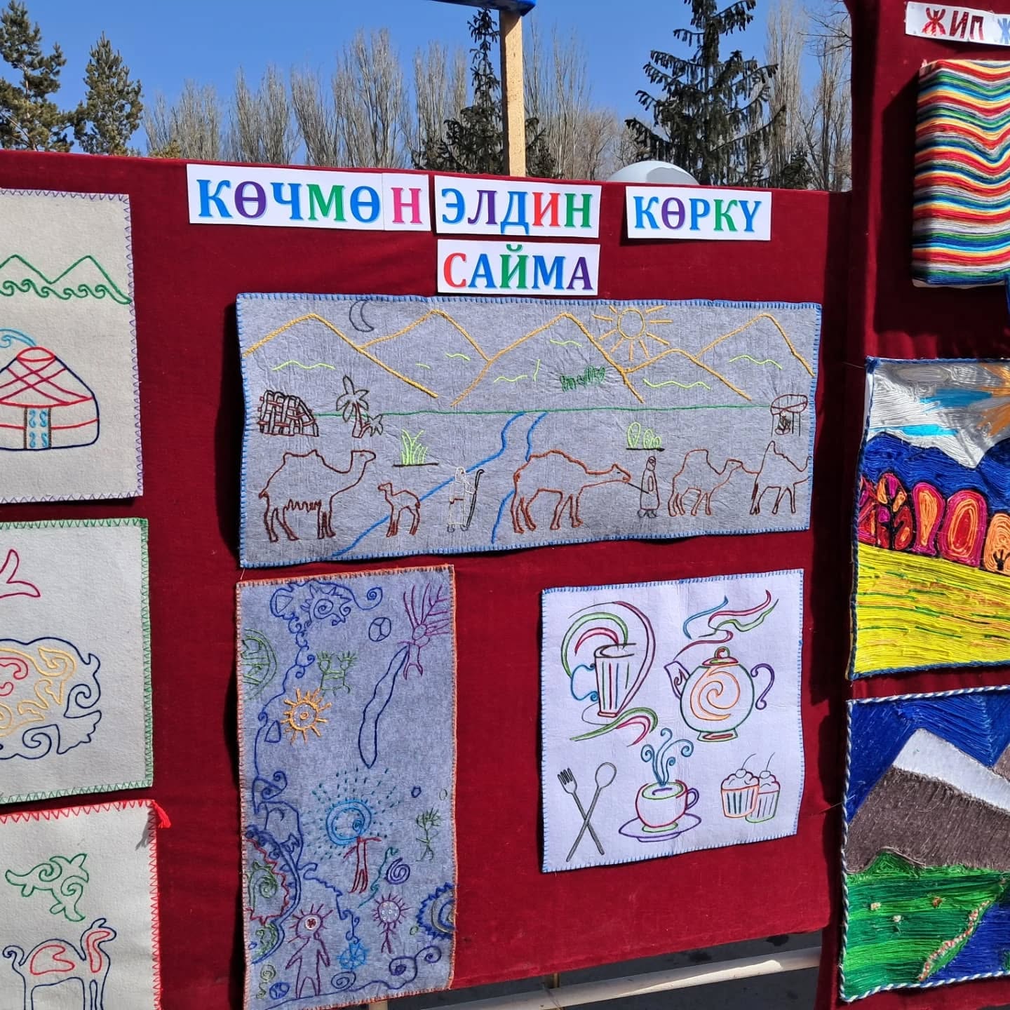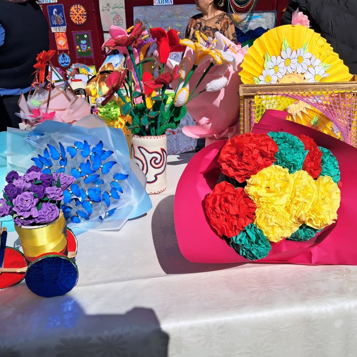 Биздин мектептин окуучуларынын, мугалимдеринин колдорунан жаралган жасалгалар да көргөзмөгө коюлду.