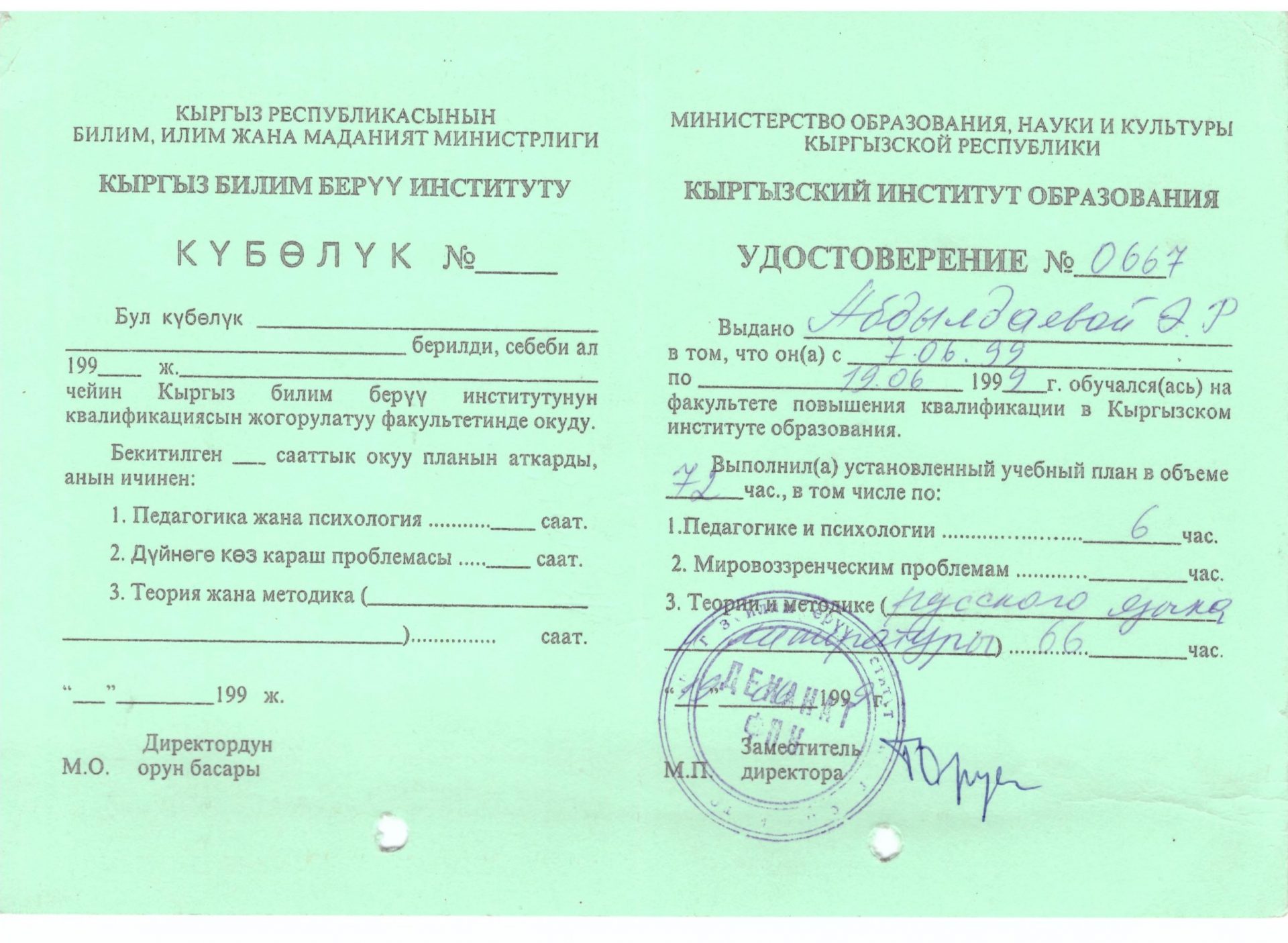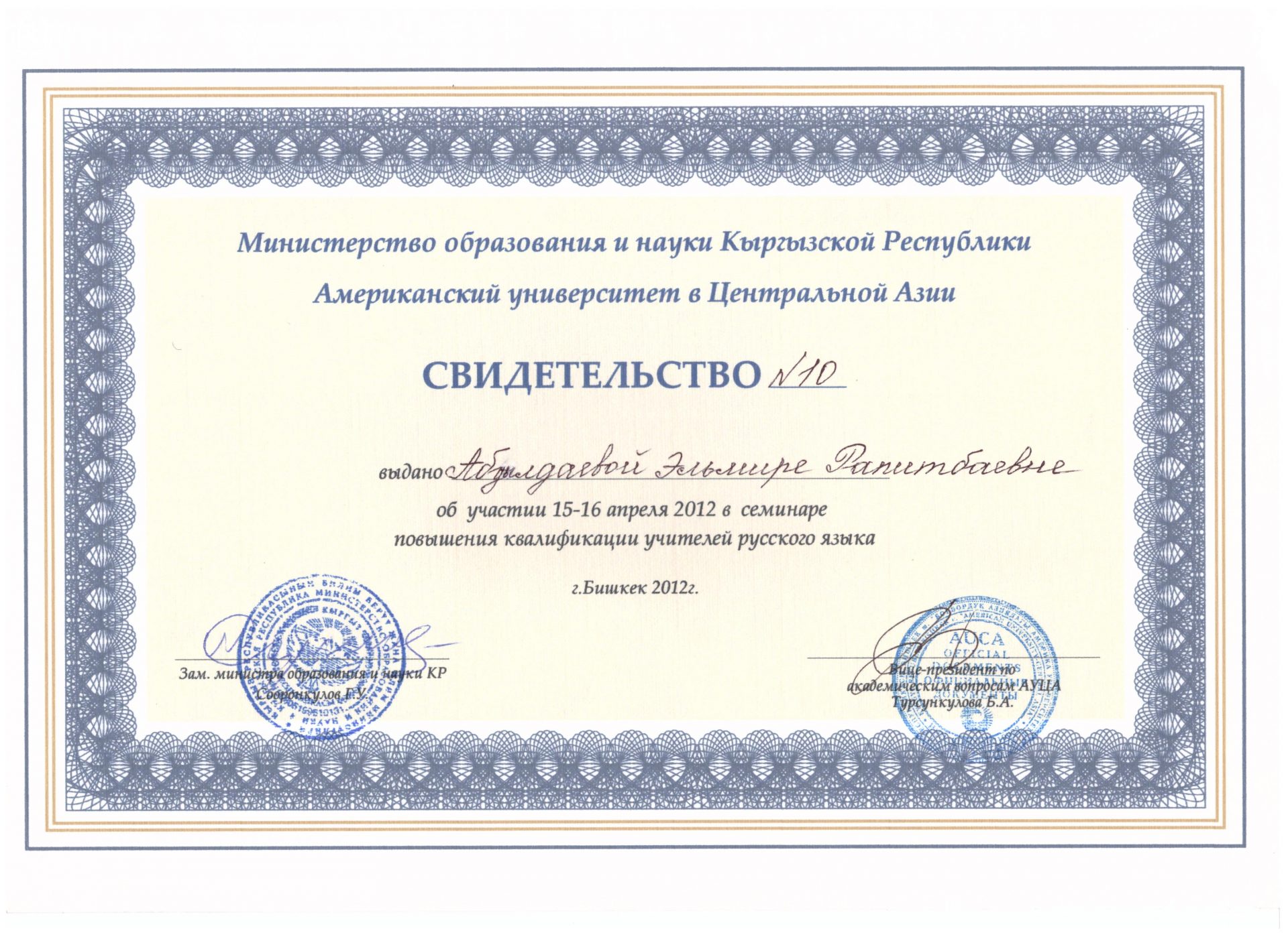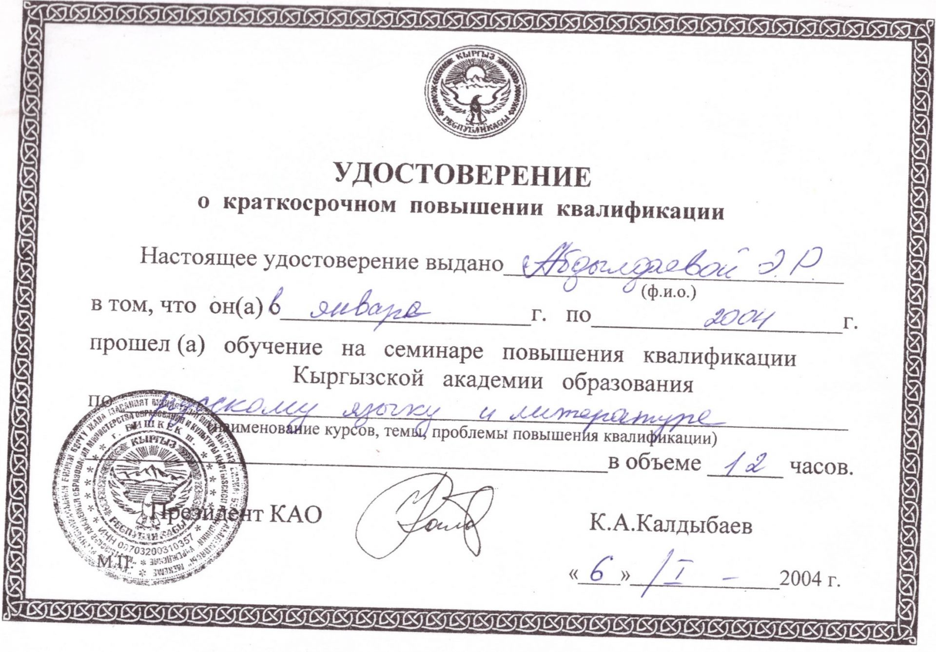 | Өз билимин жогорулатуу | - Семинар повышения квалификации, 16.04.2012г.