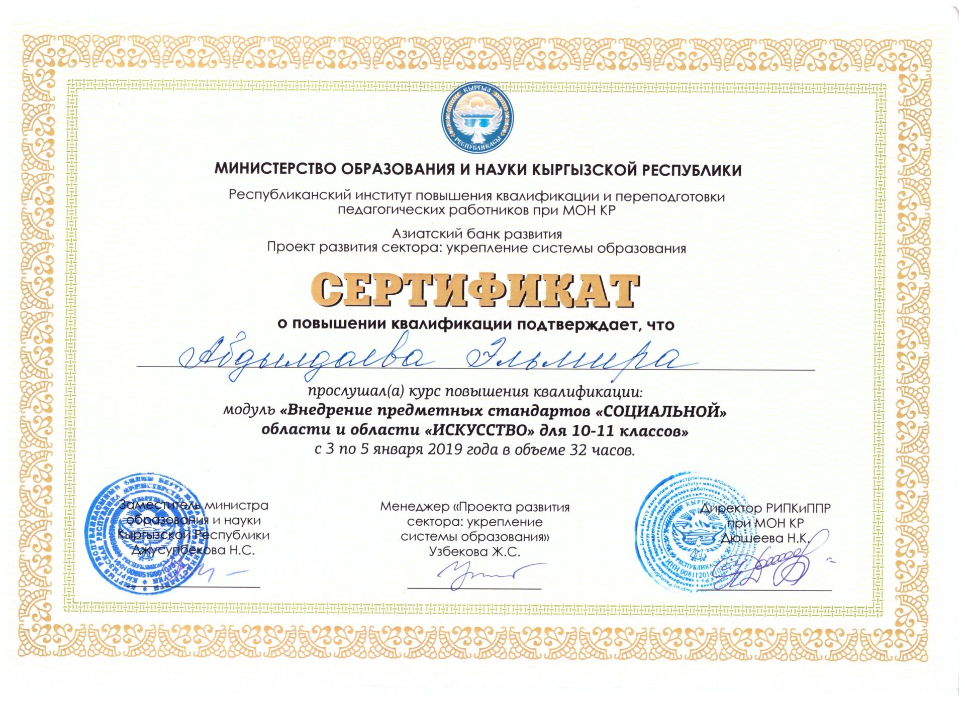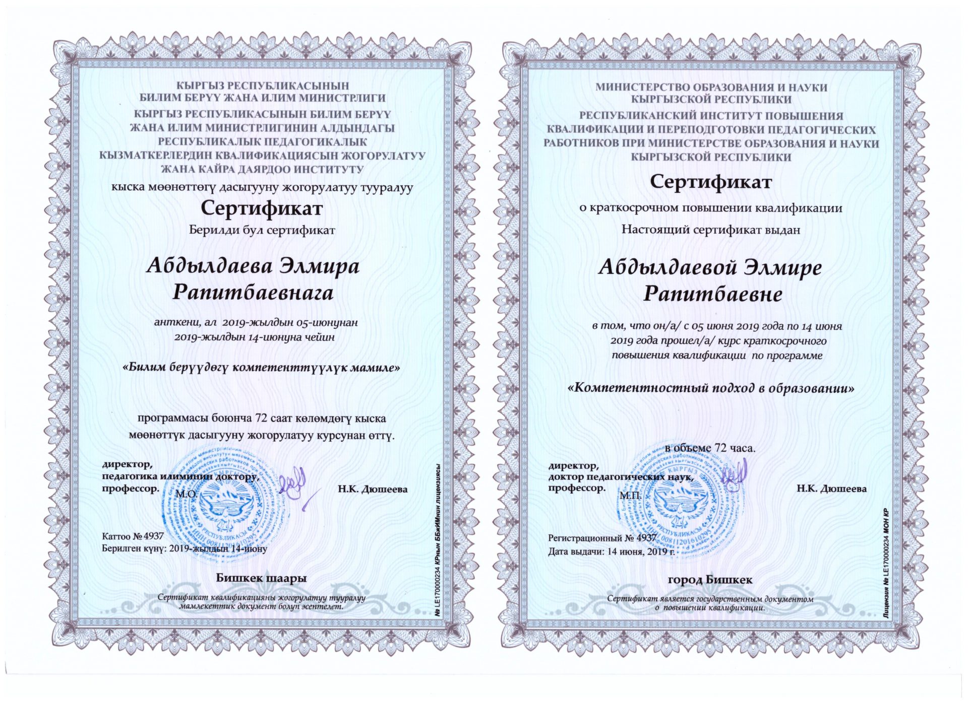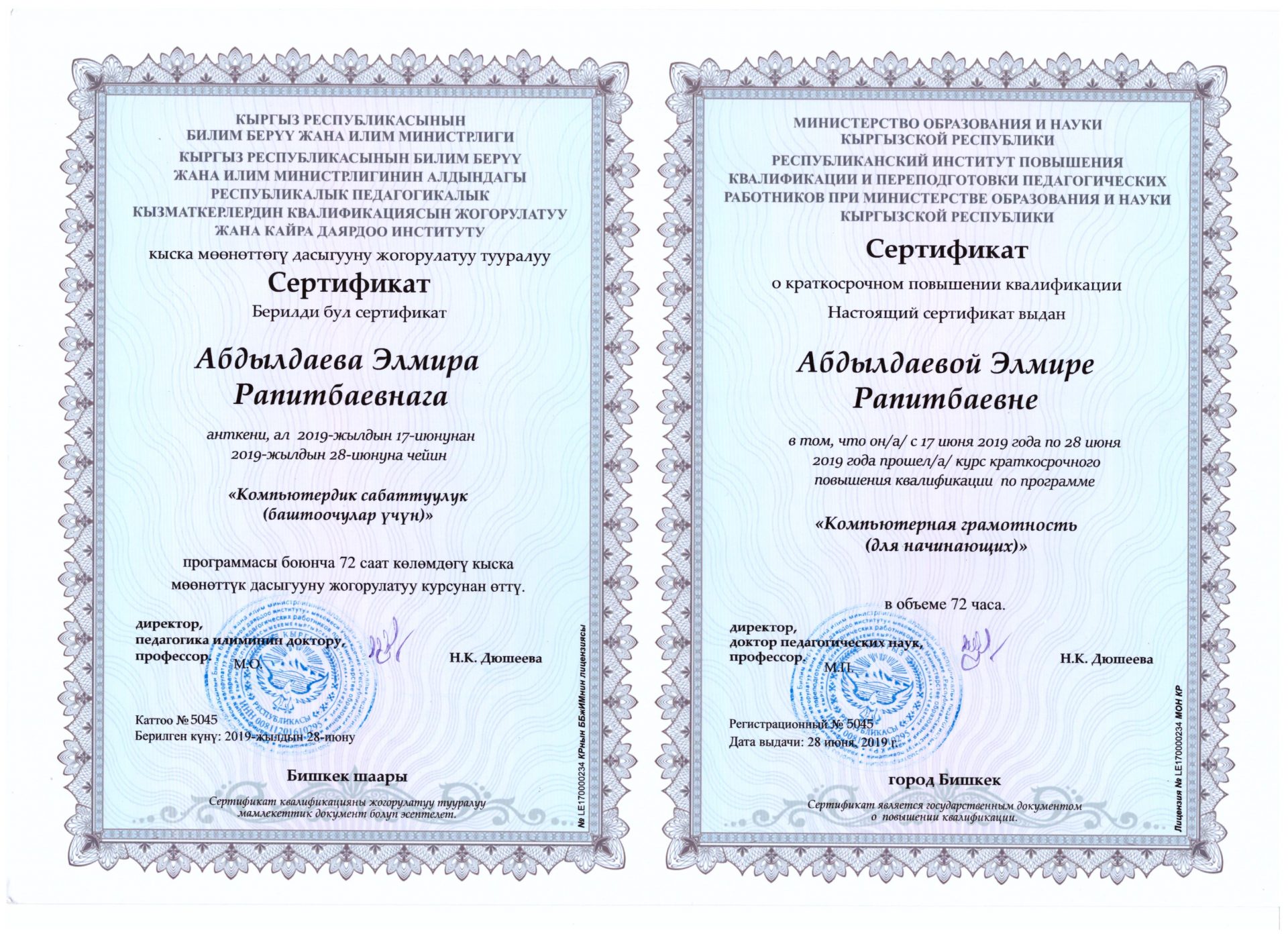 | Сыйлыктары | Кочкор райондук билим берүү бөлүмүнүн “Ардак грамотасы” 2011-ж. Нарын областык билим берүү бөлүмүнүн “Ардак грамотасы” 2013-ж. Билим берүү жана илим министрлигинин “Ардак грамотасы“ 2018-ж. |