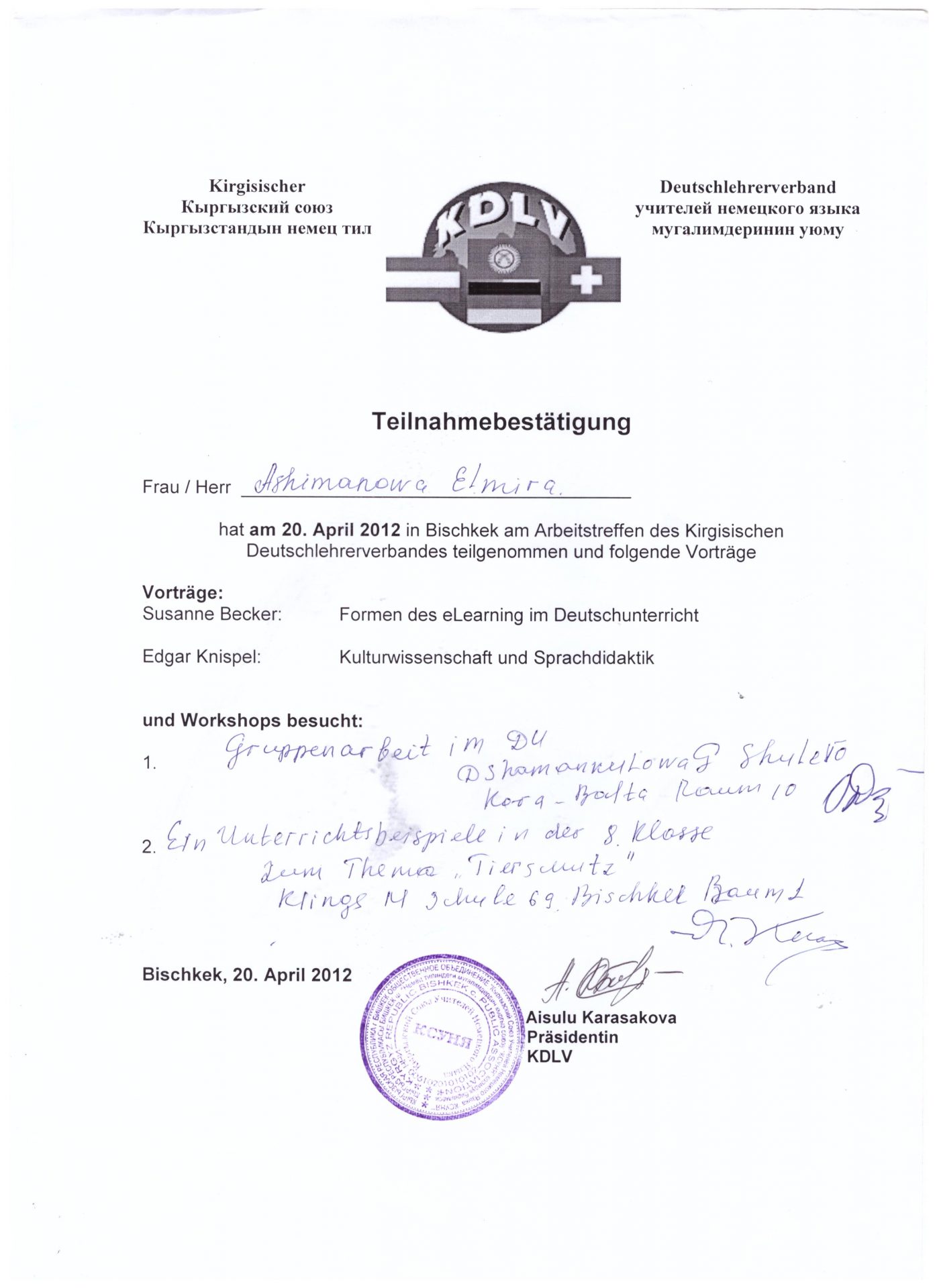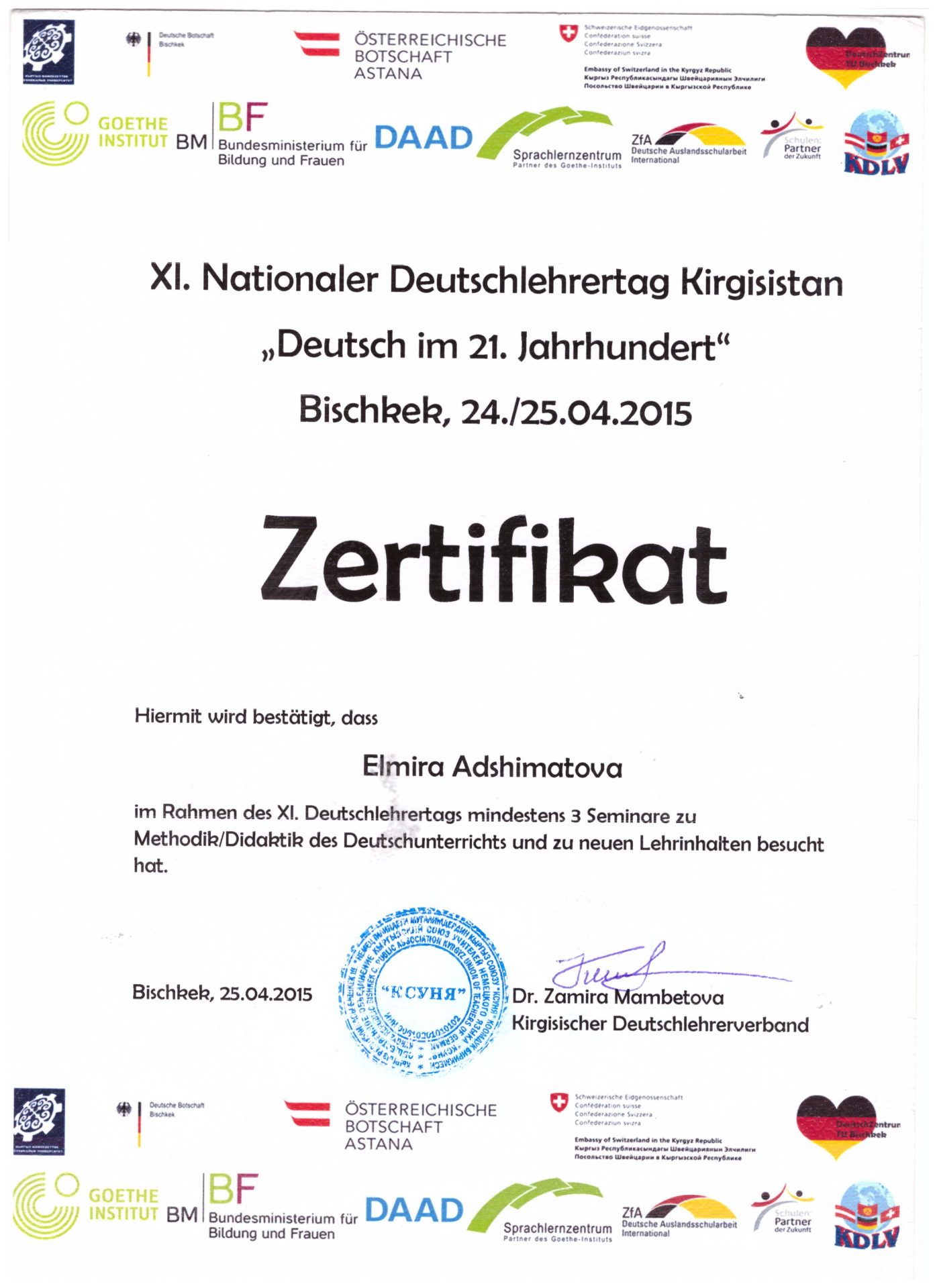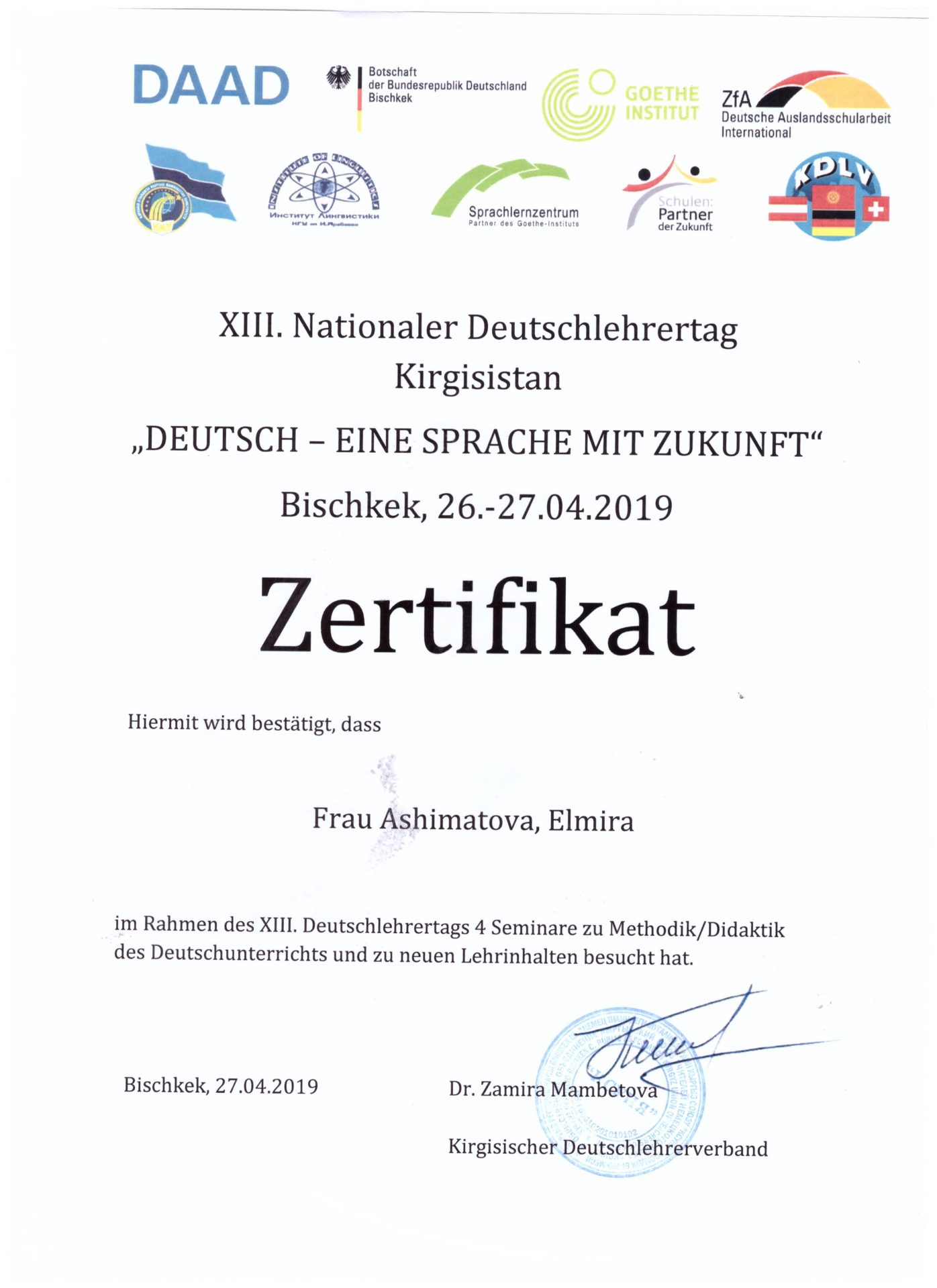 | Өз билимин жогорулатуу | - «Deutsch-eine sprache mit zukunft», 26-27.04.2019.
