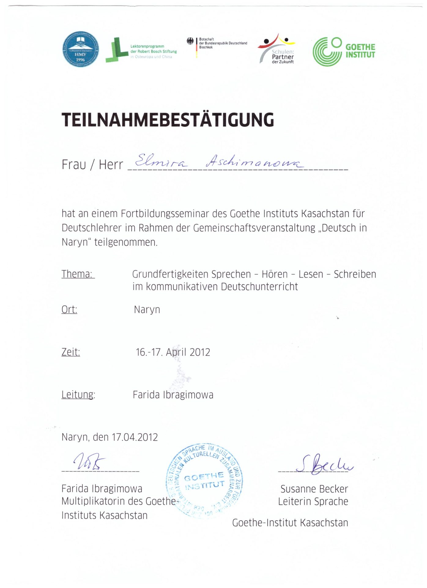 - «Methodik/Didaktik des Deutschunterrichts und zu neuen Lehrinhalten besucht hut», 25.04.2015.