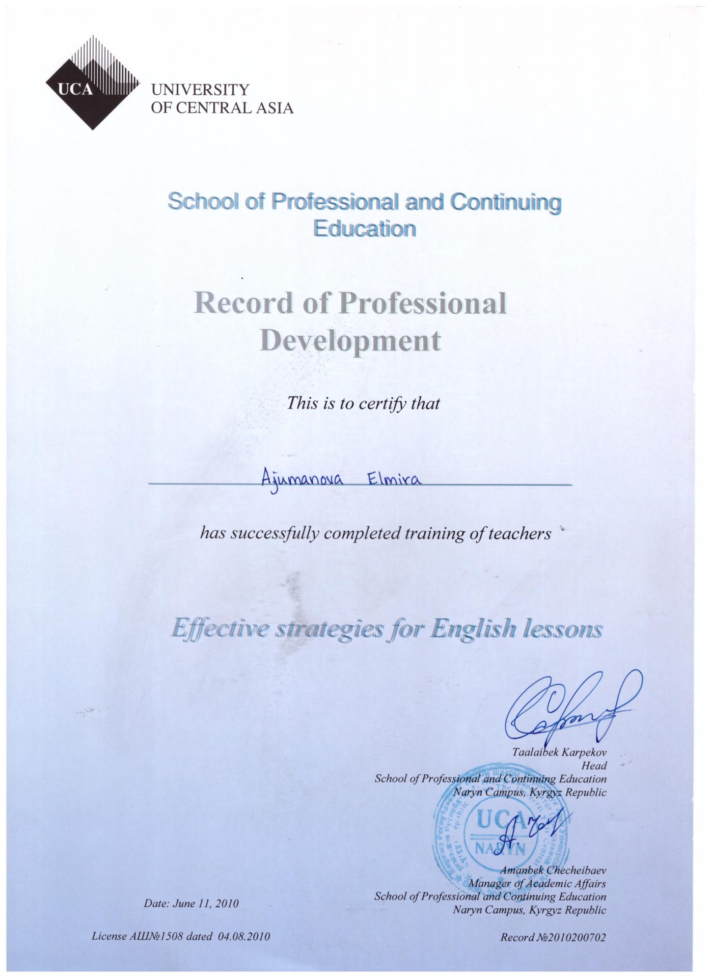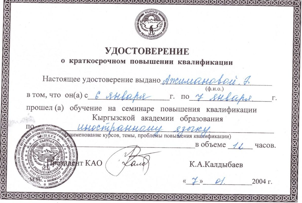 - Курс повышения квалификации по иностранному языку, 07.01.2004.