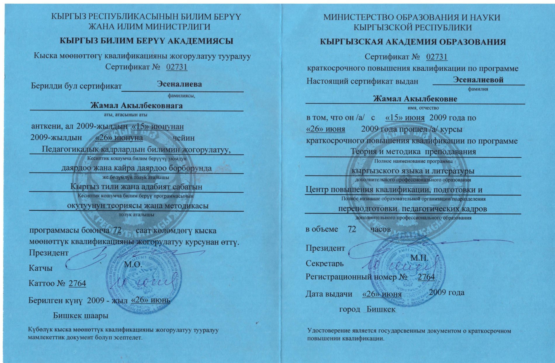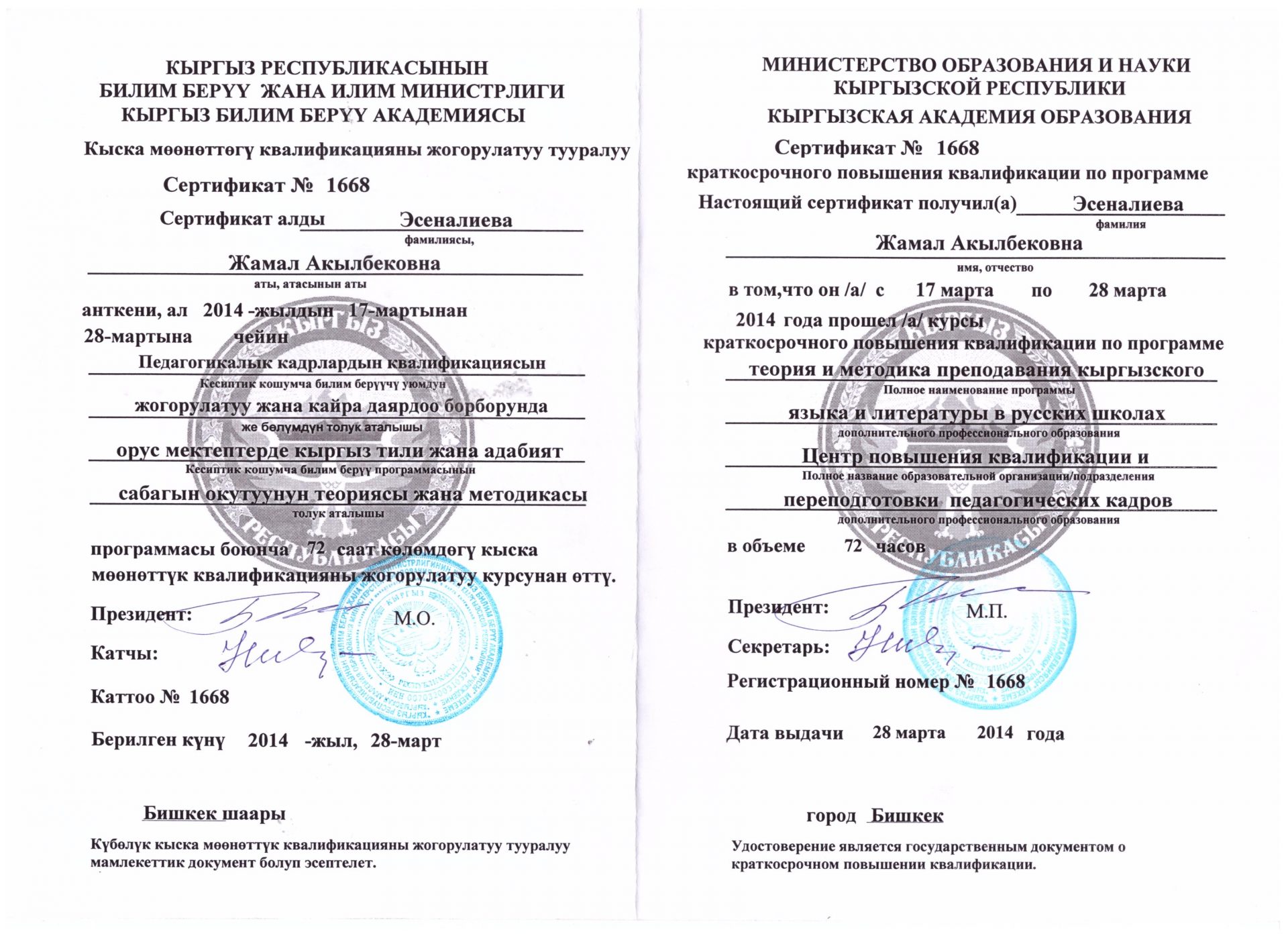 | Өз билимин жогорулатуу | - «Окутуу кыргыз тилинде жүргүзүлгөн мектептерде кыргыз тили жана адабиятын окутуунун теориясы жана методикасы», 2018-ж.