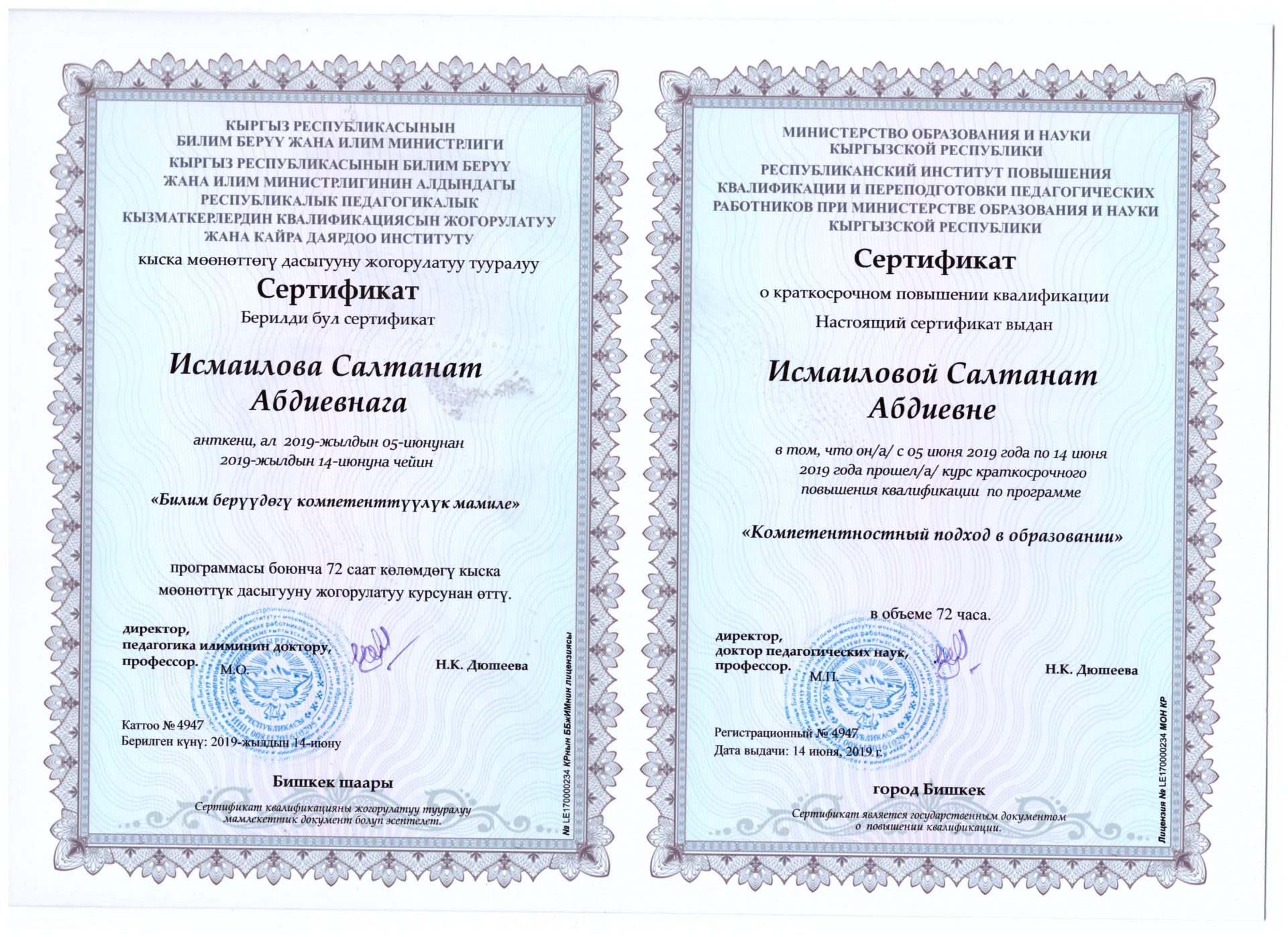 | Сыйлыктары | 1. Н Жүндүбаева атындагы мектеп-гимназиясынын «Ыроаазычылык баракчасы» 2 Билим берүү жана илим министрлигинин диплому, 2016-ж 3. «Жылдын мыкты санарип мугалими» наамы 2021-ж 4. «Туруктуу өнүгүү үчүн билим берүүдөгү мыкты практик» кароо сынагынын ЖЕҢҮҮЧҮСҮ 2021-ж 5. Кочкор айылдык кенешинин жана Айыл Өкмөтүнүн «Ардак грамотасы» 2021-ж август