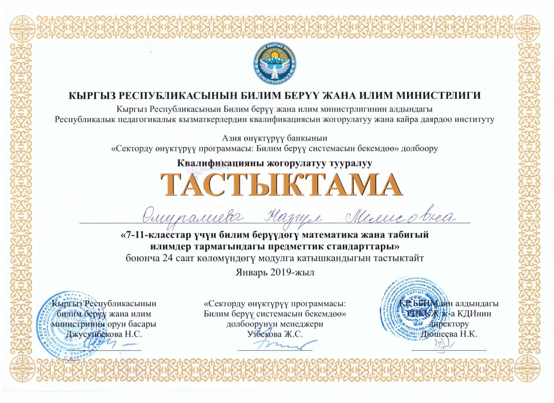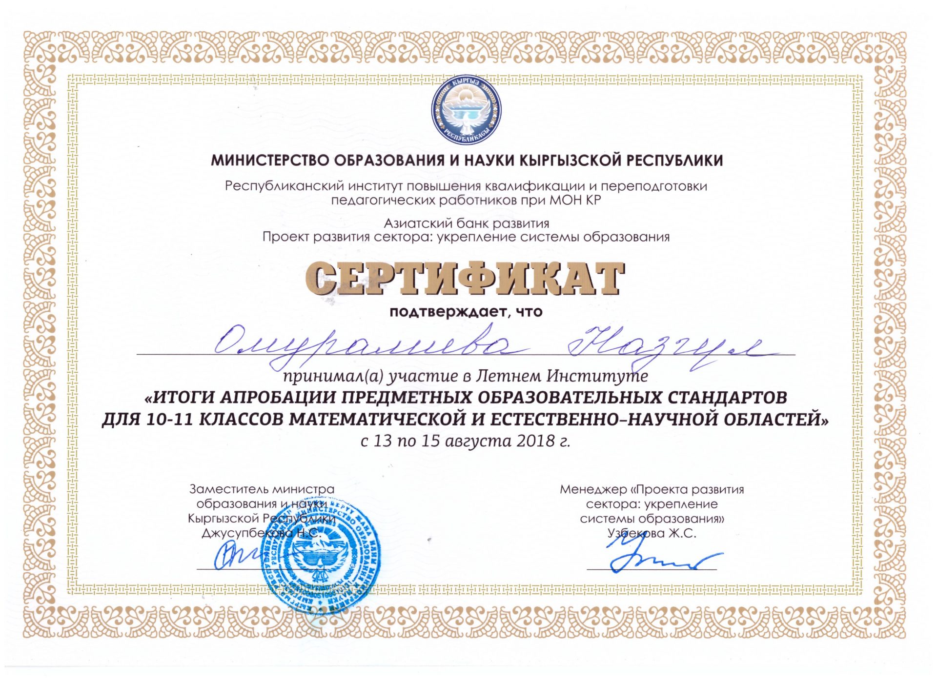 | Өз билимин жогорулатуу | - «Итоги апробации предметных образовательных стандартов для 10-11 классов математической и естественно-научной областей», 2018-г.