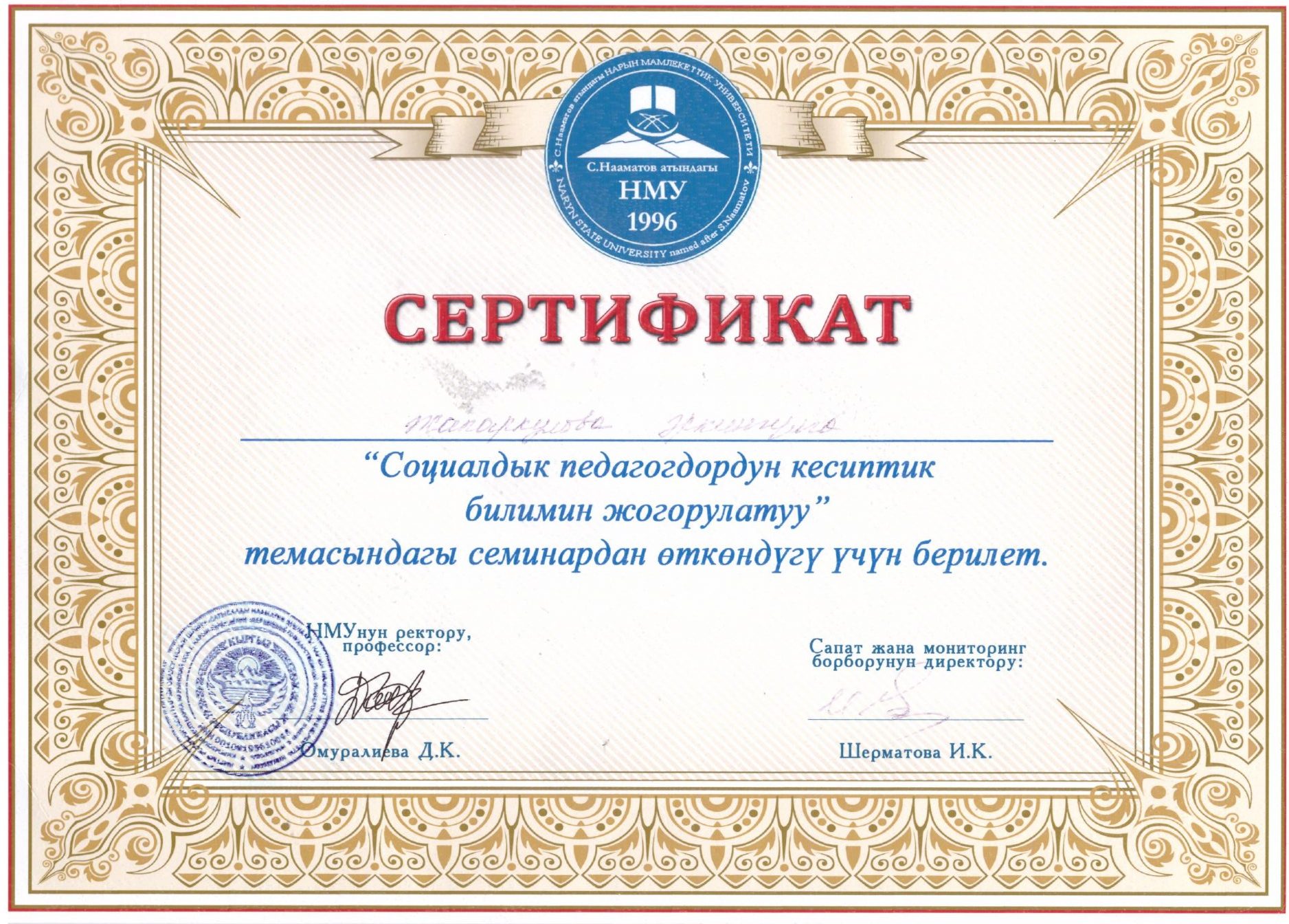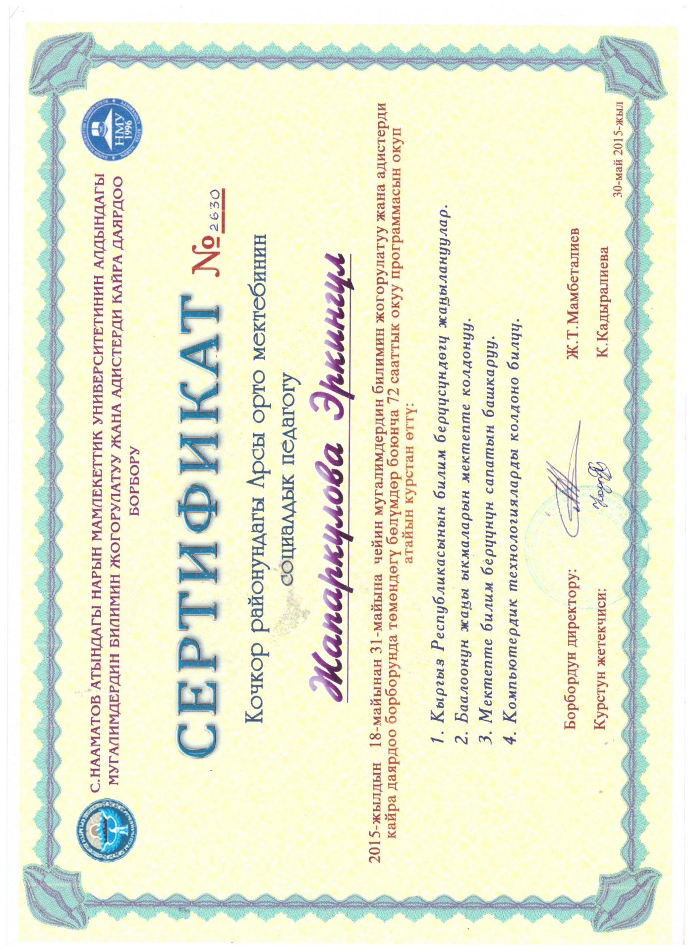 - Нарын мамлекеттик университет, Нарын шаары, Сертификат №2630, 30.05.2015-ж.