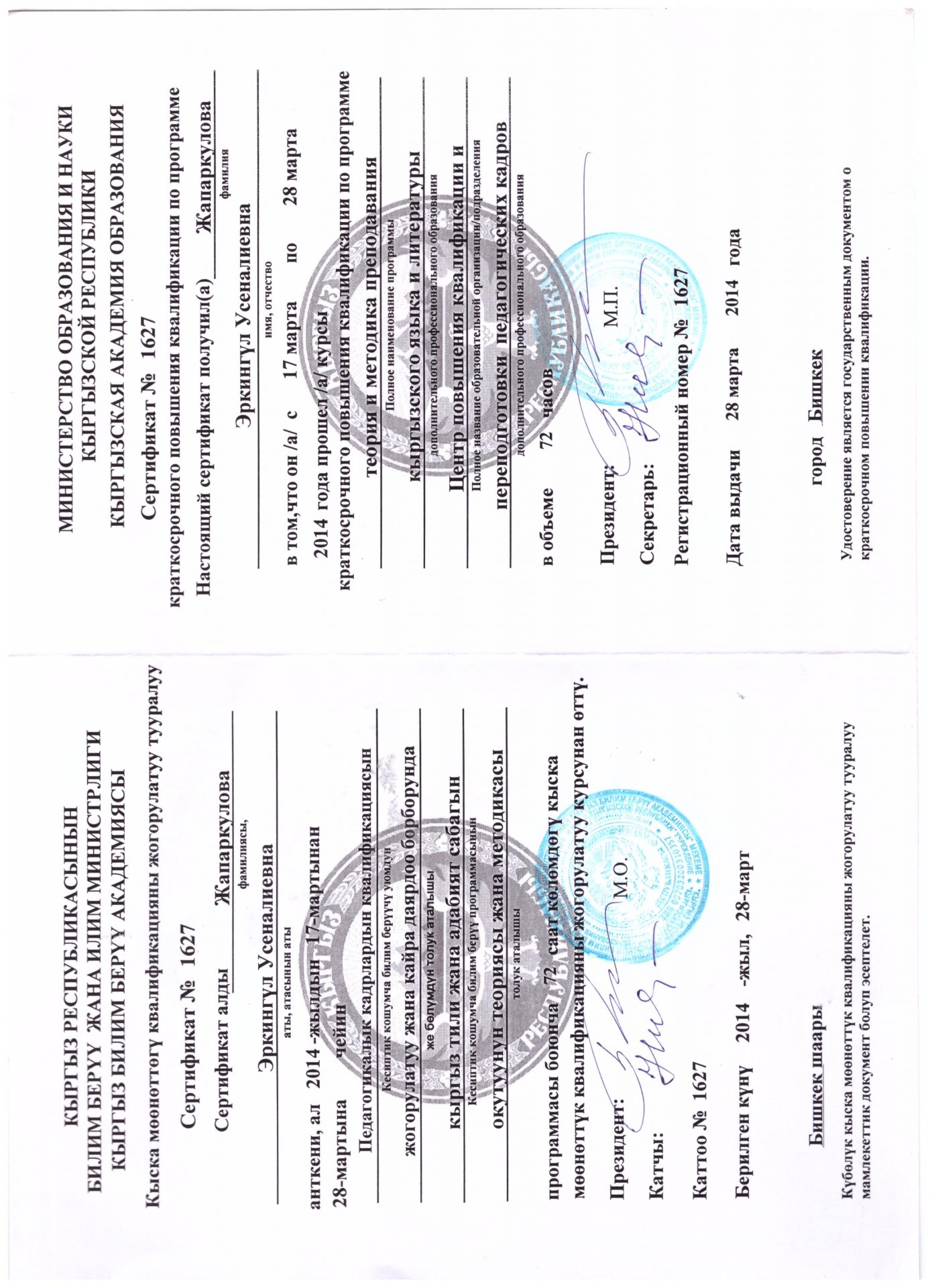 | Өз билимин жогорулатуу | - Бишкек шаары, Сертификат №1627, 28.03.2014-ж.