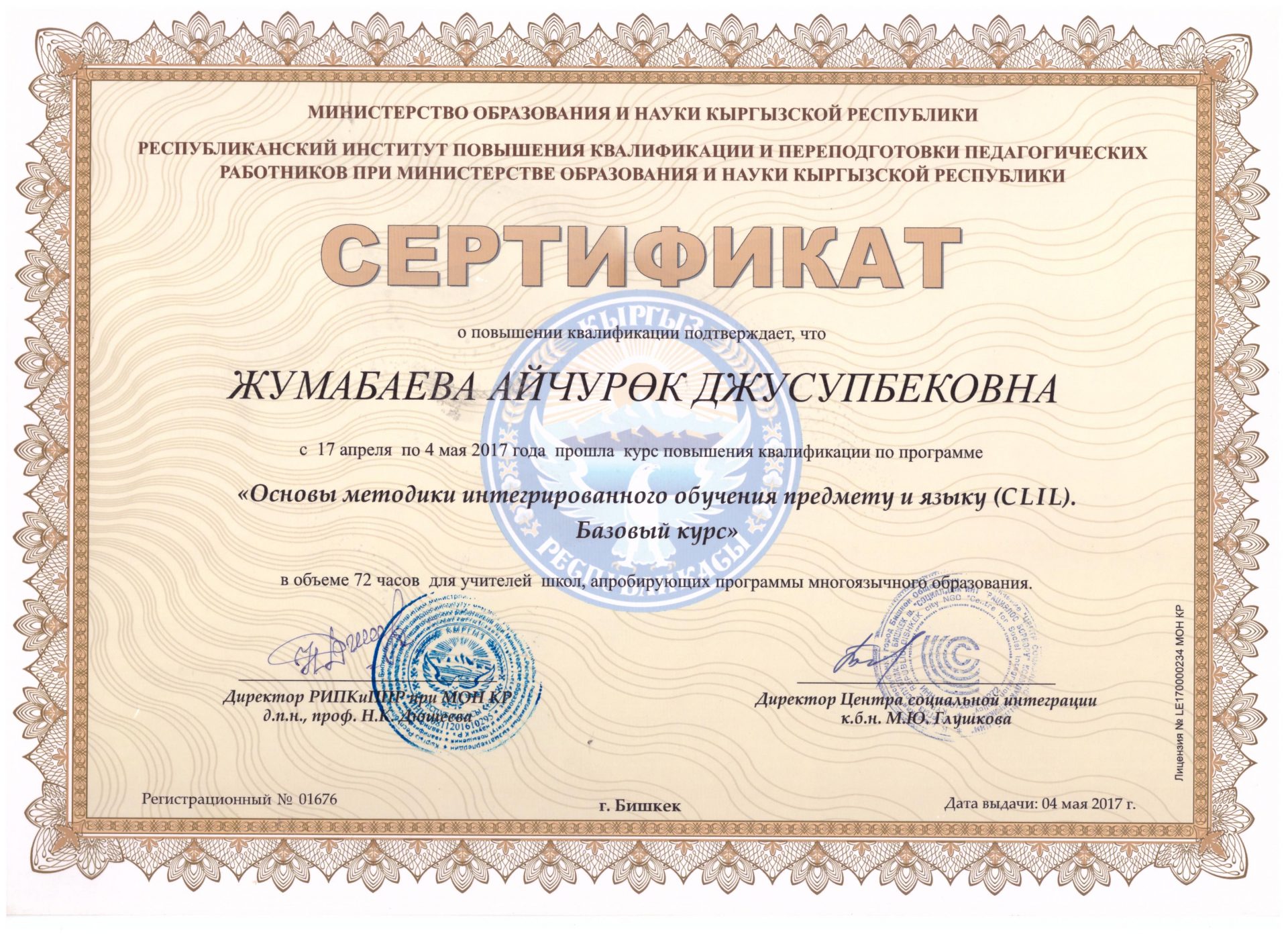 | Өз билимин жогорулатуу | - «Основы методики интегрированного обучения предмету и языку (CLIL)», г.Бишкек, 17.04-04.05, 2017-г.