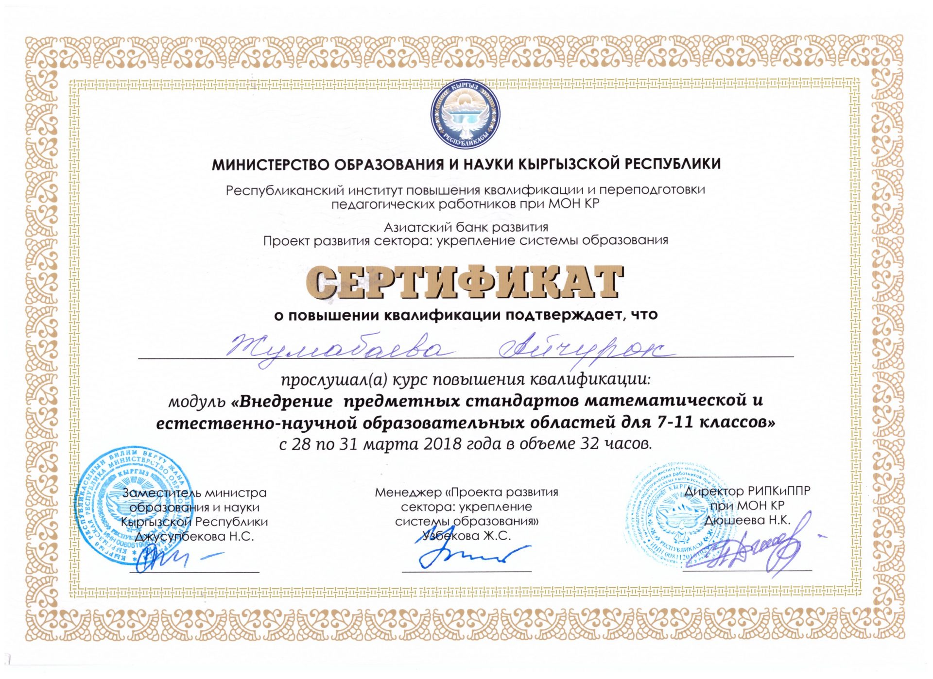 - «Внедрение предметных стандартов математической и естественно-научной образовательных областей для 7-11 классов», г.Бишкек, 28-31-март, 2018-ж.