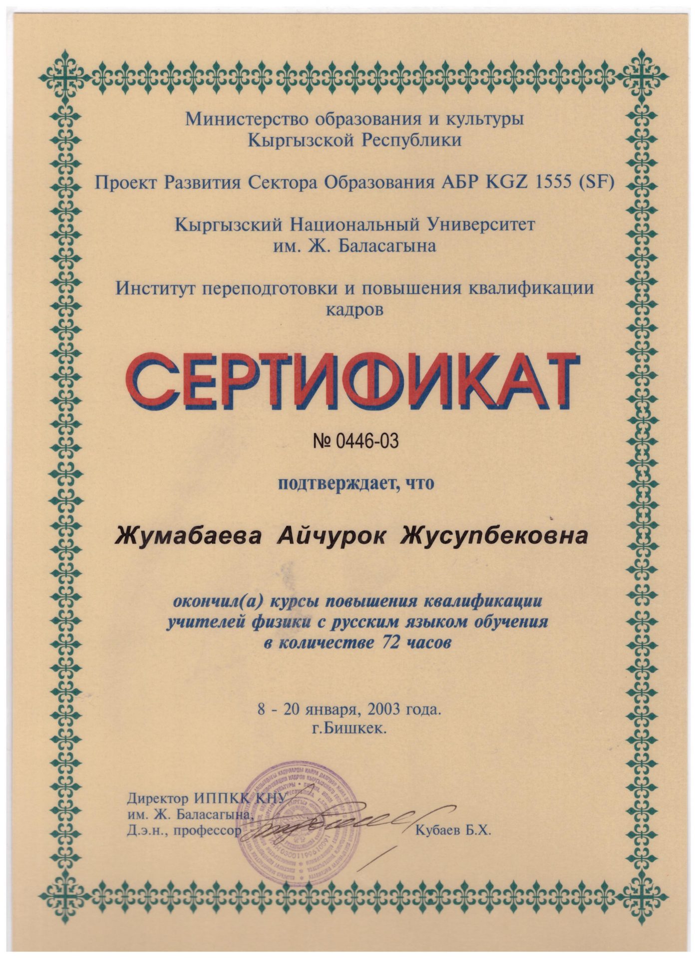 - Ж.Баласагын атындагы Кыргыз Мамлекеттик Университети, кадрларды кайра даярдоо жана квалификациясын жогорулатуу институту, Бишкек ш., 8-20-январь, 2003-ж.